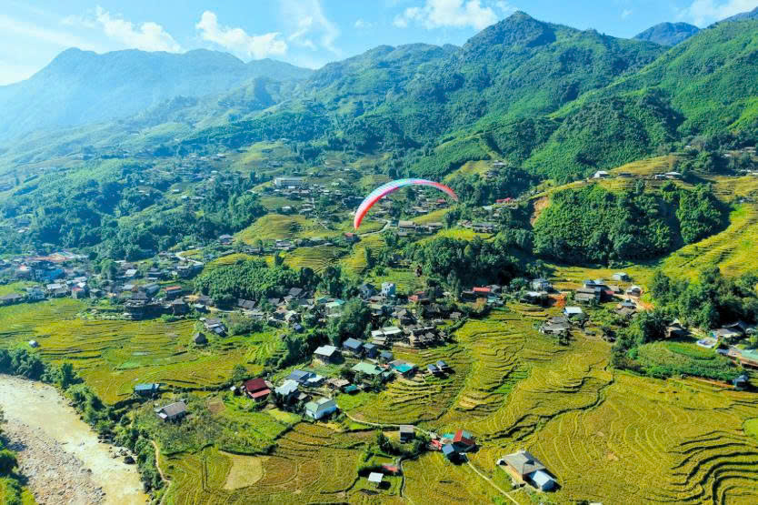 Điểm hạ cánh ở xã Tả Van, nằm giữa không gian thung lũng rộng, rất phù hợp để kết thúc chuyến bay nhẹ nhàng. Trong suốt hành trình, bạn sẽ có góc nhìn toàn cảnh Sa Pa – một trải nghiệm khác hẳn với việc đứng ở điểm ngắm thông thường.